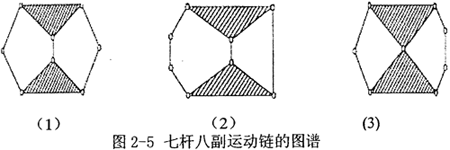 對于(5,5)來說,只有一種連接方式,作為一種混合動力驅(qū)動系統(tǒng)已有人做過研究,在本論文中,不能滿足設(shè)計要求,因此不可;而(9,11)及以上又有40個(或更多)運動鏈之多,且構(gòu)件多結(jié)構(gòu)復(fù)雜,研究起來非常困難,暫不考慮;先考慮(7,8)七桿八副機構(gòu),其構(gòu)建數(shù)量不是太多,結(jié)構(gòu)不是太復(fù)雜,共有3個運動鏈(如圖2-5),特定化后又有11種(排除同構(gòu)的機構(gòu))特定化導(dǎo)出機構(gòu),可以從中選擇可能適合的方案,因此以下將對(7,8)來詳細(xì)分析研究。
