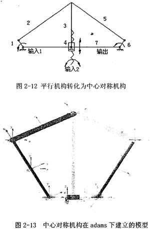 這種平行桿機構(gòu)理論上正確,但是實際上運行時會產(chǎn)生奇異,不能實際采用,因此轉(zhuǎn)化為如圖2-12所示的這種中心對稱的連桿機構(gòu)。并在adams軟件下建立了模型如圖2-13,經(jīng)分析認(rèn)為該機構(gòu)完全對稱的結(jié)構(gòu)特征,更適合于一般情況下的速度等速傳遞,不適合在沖壓工況下應(yīng)用,所以這種結(jié)構(gòu)也決定不采用。