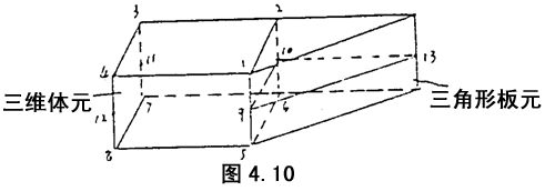 如圖所示,我們以12節(jié)點體元來模擬螺孔中心帶磨擦部分的疊片實體,右邊為三角形板元,其中第9、第10兩個節(jié)點為三維體元和三角形板元共享的節(jié)點,這樣就可以將兩個部分結合在一起了。
