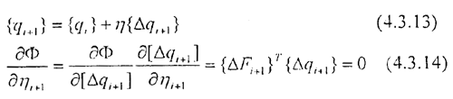 在求解方程(4.3.8)時,,尋求一個n 階矢量{q } ,實際上是在n 維空間找到一個方向和步長來滿足該方程。對于非線性方程組,要經(jīng)過多次迭代,每次迭代均要找到一個方向和步長,逐步達到平衡解,為了加速迭代的收斂,在由式(4.3.12)決定的力向上尋求一個優(yōu)化的步長,即將{△q}乘以某一標量η而使迭代加快。決定η 的原則是使能量增量φ最小化,即: