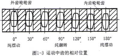 鼓形齒聯(lián)軸器的運(yùn)動(dòng)狀態(tài)是復(fù)雜的空間運(yùn)動(dòng),F(xiàn)有資料均把它簡(jiǎn)化為展開的平面運(yùn)動(dòng)進(jìn)行分析,在有軸間傾角的狀態(tài)下,將運(yùn)動(dòng)分為齒的擺動(dòng)運(yùn)動(dòng)和翻轉(zhuǎn)運(yùn)動(dòng)。這兩種運(yùn)動(dòng)在嚙合半周中經(jīng)歷純擺動(dòng)—復(fù)合運(yùn)動(dòng)—純翻轉(zhuǎn)—復(fù)合運(yùn)動(dòng)—純擺動(dòng)的循環(huán)運(yùn)動(dòng)過程,如圖1-3所示。純擺動(dòng)—純翻轉(zhuǎn)的相位差為90°。在非純擺動(dòng)和純翻轉(zhuǎn)運(yùn)動(dòng)過程中,內(nèi)外齒的相對(duì)運(yùn)動(dòng)是擺動(dòng)運(yùn)動(dòng)和翻轉(zhuǎn)運(yùn)動(dòng)的復(fù)合運(yùn)動(dòng)[68]。顯然這種簡(jiǎn)化分析方法是很粗略的,無法確切地描述空間嚙合狀態(tài),但是它對(duì)于分析齒向位移、棱邊卡死現(xiàn)象及說明某一輪齒所處周向位置是有意義的。