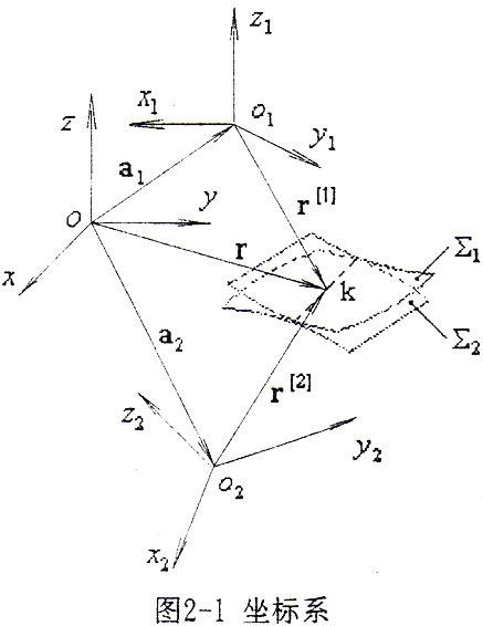 設(shè)K點(diǎn)為兩曲面受力變形后的接觸參考點(diǎn),a1、a2為靜坐標(biāo)系S原點(diǎn)到兩動(dòng)坐標(biāo)系S1和S2原點(diǎn)的徑矢;r(1)、r(2)為Σ1、Σ2上K點(diǎn)在S1、S2坐標(biāo)系的徑矢;r為K點(diǎn)在S坐標(biāo)系的徑矢。