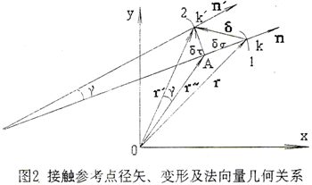 通常情況下,變形量相對于曲面參考點(diǎn)徑矢的大小為微小量,其切向分量更小,主要由撓曲變形引起。由(2-6-1)式知,γ值非常小。一般情況下,可忽略這一法線方向的改變,認(rèn)為變形后的接觸參考點(diǎn)法線方向不變,以便于求解。