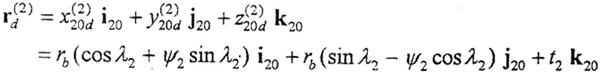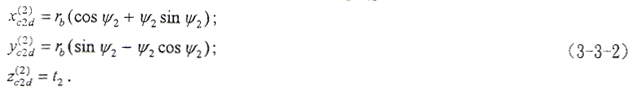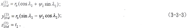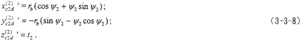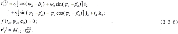 式中 ψ2、t2——曲面參變量;rb——漸開線基圓半徑。設(shè)α2為曲面某一點K處的壓力角,則有ψ2=tgα2。將(3-3-2)式轉(zhuǎn)換到S20坐標(biāo)系,方程為