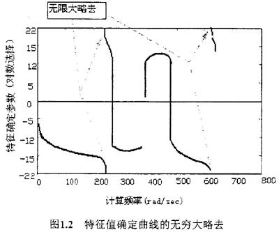 Pilkey和Leckie開發(fā)的用于分析帶分支系統(tǒng)扭振系統(tǒng)的傳遞矩陣法包括將分支系統(tǒng)簡化為一個等效單轉(zhuǎn)子系統(tǒng)。這種方法要求將分支系統(tǒng)的參數(shù)累加在分支系統(tǒng)所屬的軸段上。因為這種方法要求從主傳遞矩陣上消去分支系統(tǒng)的狀態(tài)關(guān)系,這會導(dǎo)致用根搜索法求解時丟到合理的根。如下圖1-2所示的一個頻率范圍內(nèi)的分支系統(tǒng)的特征曲線,因為無限大而略去的特點(diǎn)會導(dǎo)致丟根。