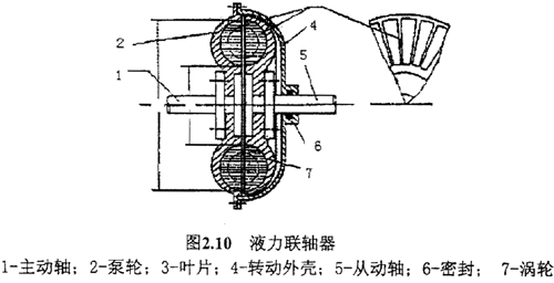 液力聯(lián)軸器中,充有工作油。當(dāng)原動機(jī)通過主動軸帶動泵輪旋轉(zhuǎn)時,因離心力的作用,工作油在葉片的帶動下由內(nèi)側(cè)(進(jìn)口)流向外緣(出口),形成高壓高速的液流,高壓高速的液流沖擊渦輪葉片,使渦輪跟著泵輪同向旋轉(zhuǎn)。工作油在渦輪中,由外緣(進(jìn)口)流向(內(nèi)側(cè))出口的過程中減壓減速,然后再流入泵輪的進(jìn)口。不斷地循環(huán),把工作油的動能和壓力能換成機(jī)械功,通過從動軸輸出,帶動工作機(jī)器。整個過程實現(xiàn)了從主動軸到從動軸的傳動。
