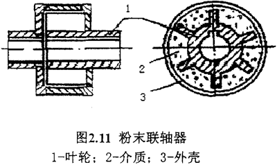 從圖2.11中我們可看出,主動件和被動件都是各自獨立回轉(zhuǎn)的零件,當(dāng)主動軸回轉(zhuǎn)時,將粉末介質(zhì)帶起而回轉(zhuǎn),轉(zhuǎn)速升高后,由于離心力的作用,使粉末介質(zhì)之間和介質(zhì)和外殼之間的摩擦力隨之增加,因而帶動被動軸回轉(zhuǎn)。