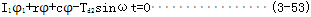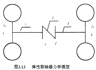 現(xiàn)單獨(dú)考慮擾動(dòng)轉(zhuǎn)矩產(chǎn)生的相對(duì)轉(zhuǎn)角φ2,目前國(guó)內(nèi)建立了圖3.13所示力學(xué)模型[2],出于橡膠件相對(duì)于兩側(cè)的鐵圈剛性很小,現(xiàn)假設(shè):(1)只有聯(lián)軸器兩側(cè)的鐵圈具有剛性,只有橡膠具有彈性和阻尼;(2)聯(lián)軸器主動(dòng)側(cè)作用有按簡(jiǎn)諧規(guī)律變化的擾動(dòng)轉(zhuǎn)矩分量Tdlsinωt此時(shí)按照動(dòng)量矩定理,按聯(lián)軸器兩側(cè)力矩平衡條件,可以分別列出兩個(gè)圓盤(pán)的轉(zhuǎn)動(dòng)運(yùn)動(dòng)方程式,即系統(tǒng)振動(dòng)的微分方程是: