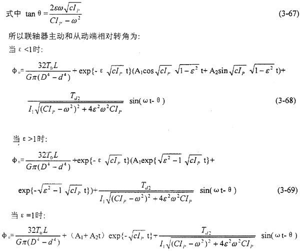比較式(3-74),(3-75),(3-76)可知,由于 ,所以當(dāng)阻尼系數(shù)等于臨界阻尼系數(shù)時(shí),產(chǎn)生的剪切應(yīng)力最小,此時(shí) 。由于對(duì)于一定的材料制作的聯(lián)軸器,因?yàn)椴牧系淖枘崽匦允且欢ǖ,因此在以后?lián)軸器的設(shè)計(jì)過(guò)程中,可以通過(guò)控制兩端的轉(zhuǎn)動(dòng)慣量,或者通過(guò)改變聯(lián)軸器本身的尺寸來(lái)控制它的扭轉(zhuǎn)剛度,力求使 的值盡可能的接近阻尼系數(shù),從而減少產(chǎn)生的剪切力,提高聯(lián)軸器的工作狀態(tài)和延長(zhǎng)聯(lián)軸器的使用壽命。
