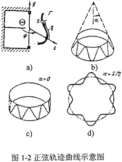 正弦活齒傳動屬于活齒少齒差行星齒輪傳動,是一種利用鋼球和正弦滾道組成的滾動嚙合變速裝置。按照正弦曲線軌跡所在回轉(zhuǎn)面的類型,正弦活齒傳動可分為平面正弦活齒、圓柱正弦活齒及圓錐正弦活齒傳動等,圖1-2所示為共扼正弦曲線軌跡的示意圖。當(dāng)φ從0到2π變化,正弦曲線Γ在回轉(zhuǎn)面上被描述出來。如果Θ代表主動軸坐標(biāo)系,則曲線Γ表示主動軸回轉(zhuǎn)面上的正弦曲線,若Θ代表殼體坐標(biāo)系,則曲線Γ表示殼體回轉(zhuǎn)面上正弦曲線;剞D(zhuǎn)面可以是錐面(圖1-2b)、圓柱面(圖1-2c)、平面(圖1-2d),還可以為拋物面、雙曲面、超環(huán)面等。若按與活齒嚙合的正弦滾道數(shù)目劃分,正弦活齒傳動可分為雙正弦活齒傳動(圖1-3)和三正弦活齒傳動(圖1-4)。