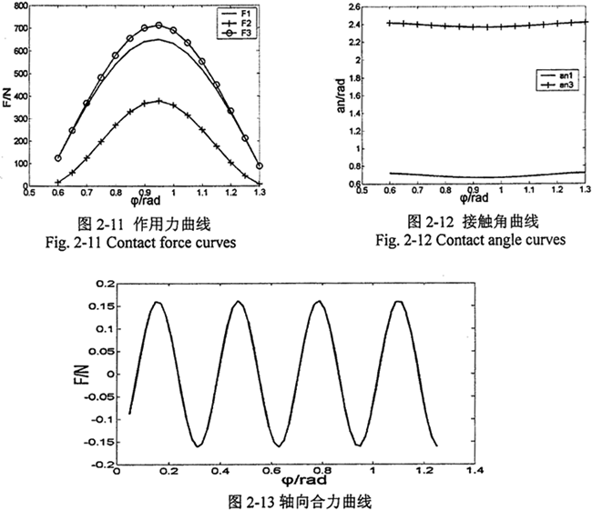 由圖2-11分析可知,在空間正弦軌跡曲線的拐點(diǎn)附近活齒受力最大,且作用在活齒上的三個(gè)力F1、F2、F3中,F(xiàn)3值最大,也就是說,在進(jìn)行接觸強(qiáng)度計(jì)算的時(shí)候,應(yīng)以活齒與殼體間的接觸情況為主要依據(jù)。接觸角αni(i=1,3)的求解為圓柱正弦活齒傳動(dòng)的結(jié)構(gòu)設(shè)計(jì)提供了必要的條件,它成為正弦滾過深度bi,(i=1,3)的主要度量依據(jù)。由圖2-13可以看出圓柱正弦活齒傳動(dòng)主動(dòng)軸上的軸向合力幾乎為零,且該傳動(dòng)輸入軸的旋轉(zhuǎn)中心與其幾何中心重合,屬于自平衡結(jié)構(gòu),避免了慣性力的產(chǎn)生。因此只需采用單激波器的結(jié)構(gòu)型式即可使慣性力和作用力達(dá)到平衡,縮短了傳動(dòng)的運(yùn)動(dòng)鏈,減少了動(dòng)力損耗,提高了傳動(dòng)系統(tǒng)的效率和運(yùn)動(dòng)穩(wěn)定性。