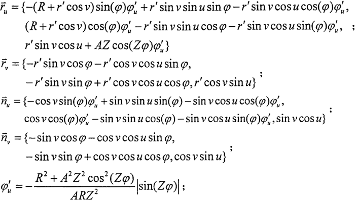 在進(jìn)行圓柱正弦活齒傳動(dòng)接觸強(qiáng)度分析時(shí),需要利用正弦滾道齒面的主曲盆和主曲率半徑,為此需對正弦滾道齒面的主曲率和主曲率半徑進(jìn)行分析計(jì)算。根據(jù)微分幾何理論,除在曲面上的奇異點(diǎn)之外,法曲率隨著所選取的方向下同而變化,而在一個(gè)非奇異的固定點(diǎn),沿不同方向的法曲率之中有其最大值和最小值,而這最大值法曲率和最小值法曲率及分別稱為曲面在該點(diǎn)的兩個(gè)主曲率,當(dāng)主曲率不為零時(shí),主曲率的倒數(shù)稱為主曲率半徑;對應(yīng)主曲率的方向稱為主方向,并且兩個(gè)主方向互相垂直。