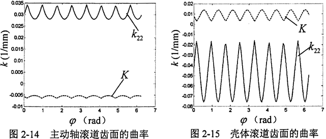 根據(jù)式(2-32),應(yīng)用Matlab編程計(jì)算得到滾道齒面與活齒接觸點(diǎn)處的主曲率與全曲率的變化曲線如圖2-14、圖2-15。從圖中可見,主動(dòng)軸正弦滾道齒面在接觸點(diǎn)處的全曲率恒為負(fù)值,根據(jù)微分幾何中的定義,則該接觸點(diǎn)為雙曲點(diǎn),而殼體正弦滾道齒面在接觸點(diǎn)處的全碘率恒為正值,則該接觸點(diǎn)為隨圓點(diǎn)。從數(shù)值上看,曲率的變化范圍大,傳動(dòng)比較平穩(wěn)。