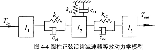 根據(jù)上面敘述的方法,可以建立起如圖4-3所示的動力學(xué)模型。為便于分析,將圓柱正弦活齒傳動系統(tǒng)的動力學(xué)模型簡化,由于在一個工作周期中,各活齒在扭振方向的工作狀態(tài)完全相同,故可將所有的活齒等效為一個慣性元件,并根據(jù)熱能不變的原則,將各活齒副的嚙合剛度轉(zhuǎn)化為等效的扭轉(zhuǎn)剛度,然后疊加得出整體的等效扭轉(zhuǎn)剛度。由此,各活齒與主動軸、導(dǎo)架及殼體間并聯(lián)的彈性連接和阻尼分別等效為一個彈性軸段。等效簡化后的動力學(xué)模型如圖4-4所示。