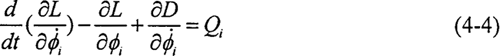 對轉(zhuǎn)換成鏈狀結(jié)構(gòu)的系統(tǒng),應(yīng)用拉格朗日法建立系統(tǒng)的扭振動力學(xué)方程,系統(tǒng)中帶有粘性阻尼,因此列出含有耗散函數(shù)的拉格朗日方程