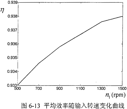 同樣方式測得當(dāng)輸入轉(zhuǎn)速分別為700rpm、900 rpm、1100 rpm、1300 rpm、1500 rpm時,減速呂樣機(jī)的平均效率隨輸入轉(zhuǎn)速變化曲線如圖6-13。通過測試結(jié)果表明,在低中速情況下,減速器的傳動效率受其轉(zhuǎn)速的影響不明顯,由于此時潤滑脂溫度較低,隨著轉(zhuǎn)速的增加,減速器的傳動效率略有提高,其平均值在93%以上,由引說明本文設(shè)計的減速器具有較高的傳動效率。