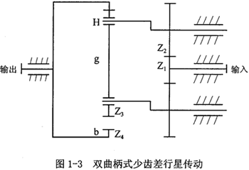 RV傳動作為一種新型傳動,由于具有良好的動、靜態(tài)特性,對其進(jìn)行的研究和應(yīng)用較為廣泛。雙曲柄式少齒差行星傳動則將輸入運(yùn)動和輸出運(yùn)動分別由中心輪和行星輪承擔(dān),如圖1-3所示。該機(jī)構(gòu)一方面省取了輸出機(jī)構(gòu)W,避免了由輸出機(jī)構(gòu)所帶來的弊病,另一方面用一個(gè)平行四邊形機(jī)構(gòu)(雙曲柄)代替了轉(zhuǎn)臂H,設(shè)置了同步嚙合的定軸齒輪副,經(jīng)減速后再將運(yùn)動輸送給少齒差輪系,這樣可獲得更大的速比,使機(jī)構(gòu)更為緊湊和有效;當(dāng)總速比相同時(shí),動軸上齒輪的轉(zhuǎn)速較低、運(yùn)轉(zhuǎn)比較平穩(wěn)、動載荷和噪音較小。