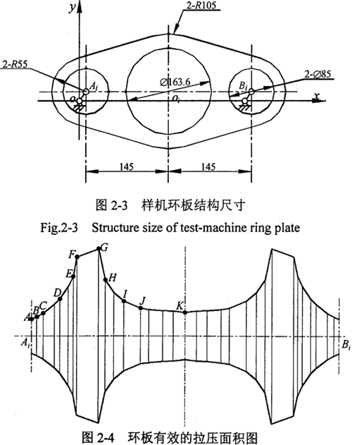 三環(huán)減速機(jī)運(yùn)動屬靜不定問題,用一般平面剛體力學(xué)方法無法完全求出機(jī)構(gòu)的作用力,影響到三環(huán)減速器設(shè)計(jì)和傳動性能的改進(jìn)。為此需要考慮各構(gòu)件的變形,建立能充分反映三環(huán)減速器實(shí)際受力的變形協(xié)調(diào)條件作為補(bǔ)充方程。三環(huán)減速機(jī)傳動機(jī)構(gòu)是雙曲柄連桿機(jī)構(gòu),曲柄的旋轉(zhuǎn)半徑是偏心軸的偏心距,曲柄布置在由支撐軸承支承的偏心軸上,環(huán)板是雙曲柄機(jī)構(gòu)的連桿,傳動過程中的主要變形有各構(gòu)件的接觸變形、軸的扭轉(zhuǎn)彎曲變形、環(huán)板的拉壓變形等等。根據(jù)位移變形分析可知,軸的彎曲變形和環(huán)板的拉壓變形是主要的變形形式。對于筆者設(shè)計(jì)的如圖2-3所示的環(huán)板,設(shè)A為輸入軸,B為輸出軸。為了計(jì)算上的方便,以前將其簡化為等截面桿處理。實(shí)際上,由于有效截面的最大面積是最小截面面積的5倍多,這種簡單地處理和實(shí)際有較大的差別。環(huán)板受拉壓變形時(shí)的有效拉壓面積的形狀如圖2-4所示(單位:mm)。
