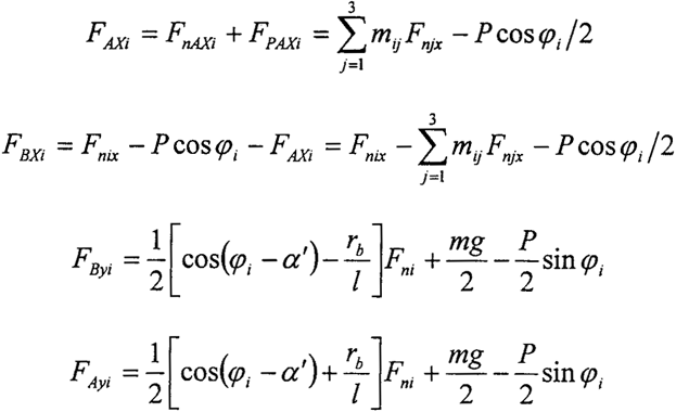 ∑Fnxi=FnAxi+FnBxi-Fni·sin(φi-α′)=0 (2-18)