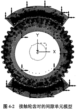 重慶大學機械傳動國家重點實驗室對三環(huán)減速器的內齒環(huán)板所做的應力分析以及對少齒差內嚙合齒輪輪齒接觸問題研究均表明,三環(huán)減速器是多齒嚙合的。根據有關理論,筆者所在的課題組對完全平衡三環(huán)減速器的輪齒應力和多齒嚙合問題進行了理論計算和實驗研究,結果表明,三環(huán)傳動由于嚙合過程中的輪齒受力變形形成了多齒接觸,各齒上的載荷分布近似0°~180°間的正弦關系。圖4-2所示是接觸輪齒對的間隙單元模型。