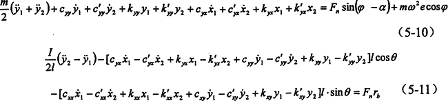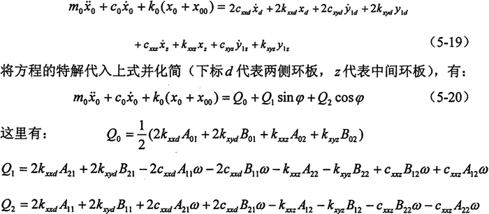 由第三章的分析知,油膜力是復(fù)雜的非周期性函數(shù),考慮到軸徑的振幅很小,對油膜力作線性化處理(所得函數(shù)仍含有耦合項),由于油膜剛度較轉(zhuǎn)臂軸承和偏心軸的剛度小的多,這里僅考慮油膜的影響,應(yīng)用牛頓第二定律可列出該環(huán)板的運動微分方程(先不考慮環(huán)板的標(biāo)號)。
