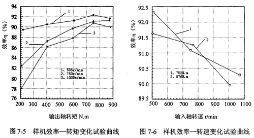 在恒定轉速變轉矩和恒定轉矩變轉速兩種工況下測得的數(shù)據(jù)經(jīng)過處理后,再利用公式(7-1)計算,便可得到實測的效率曲線如圖7-5和7-6所示。