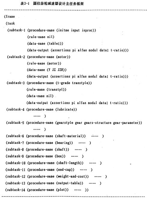 圓柱齒輪減速器的設(shè)計(jì)過(guò)程通過(guò)仔細(xì)的分析并進(jìn)行歸納,則具有明顯的階段性,可表示為一系列的設(shè)計(jì)任務(wù)的鏈?zhǔn)叫蛄小H缭O(shè)計(jì)任務(wù)描述的輸入過(guò)程,原動(dòng)機(jī)械的選擇和確定過(guò)程,傳動(dòng)級(jí)數(shù)和傳動(dòng)形式的選擇和確定過(guò)程。潤(rùn)滑方式的選擇和確定過(guò)程,齒輪傳動(dòng)參數(shù)和齒輪結(jié)構(gòu)的選擇和計(jì)算過(guò)程;……。其中每一個(gè)設(shè)計(jì)過(guò)程都將設(shè)計(jì)結(jié)果傳遞給后繼設(shè)計(jì)過(guò)程。對(duì)設(shè)計(jì)任務(wù)進(jìn)行這樣的分階段描述,使整個(gè)設(shè)計(jì)過(guò)程和設(shè)計(jì)任務(wù)間的接口形式的描述大大的簡(jiǎn)化了。與設(shè)計(jì)過(guò)程的分階段描述相對(duì)應(yīng),對(duì)系統(tǒng)的產(chǎn)生式知識(shí)進(jìn)行分類,將與一設(shè)計(jì)階段任務(wù)相關(guān)的產(chǎn)生式知識(shí)歸結(jié)在一起,形成對(duì)應(yīng)于該階段設(shè)計(jì)任務(wù)的產(chǎn)生式知識(shí)元。同時(shí),對(duì)較通用的產(chǎn)生式知識(shí)形成通用規(guī)則知識(shí)元。在此基礎(chǔ)上,系統(tǒng)通過(guò)不同的設(shè)計(jì)階段調(diào)度相應(yīng)的知識(shí)元,并與通用知識(shí)元一起動(dòng)態(tài)形成設(shè)計(jì)過(guò)程的產(chǎn)生式規(guī)則庫(kù),從而,形成設(shè)計(jì)過(guò)程產(chǎn)生式知識(shí)的調(diào)用。這樣作具有: