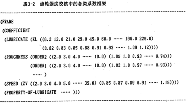 (2)圖表知識(shí)的數(shù)據(jù)化:圖表知識(shí)的數(shù)據(jù)化過(guò)程是首先將圖表進(jìn)行離散處理,然后,再對(duì)離散數(shù)據(jù)按數(shù)表型知識(shí)進(jìn)行處理。表3-2是齒輪強(qiáng)度校核中的各類圖表系數(shù)數(shù)據(jù)化后用框架形式表達(dá)的知識(shí)。其中,有潤(rùn)滑劑(lubricator)系數(shù)KL,粗糙度(roughness)系數(shù)orderl (淬火齒面)、order2(調(diào)質(zhì)齒面),……。