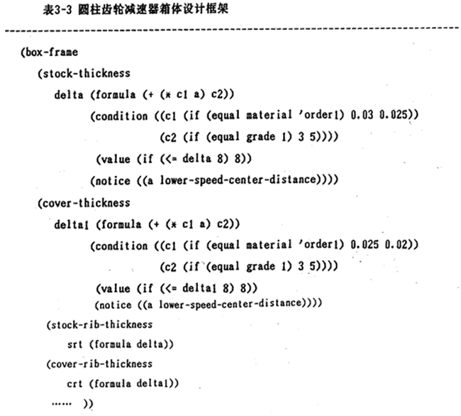 圓柱齒輪減速器專家系統(tǒng)設(shè)計(jì)中,變體框架知識(shí)元應(yīng)用的非常廣泛,表3-3是圓柱齒輪減速器箱體結(jié)構(gòu)參數(shù)設(shè)計(jì)時(shí)采用的框架。表3-3是表3-4所表示的知識(shí)的再現(xiàn)。