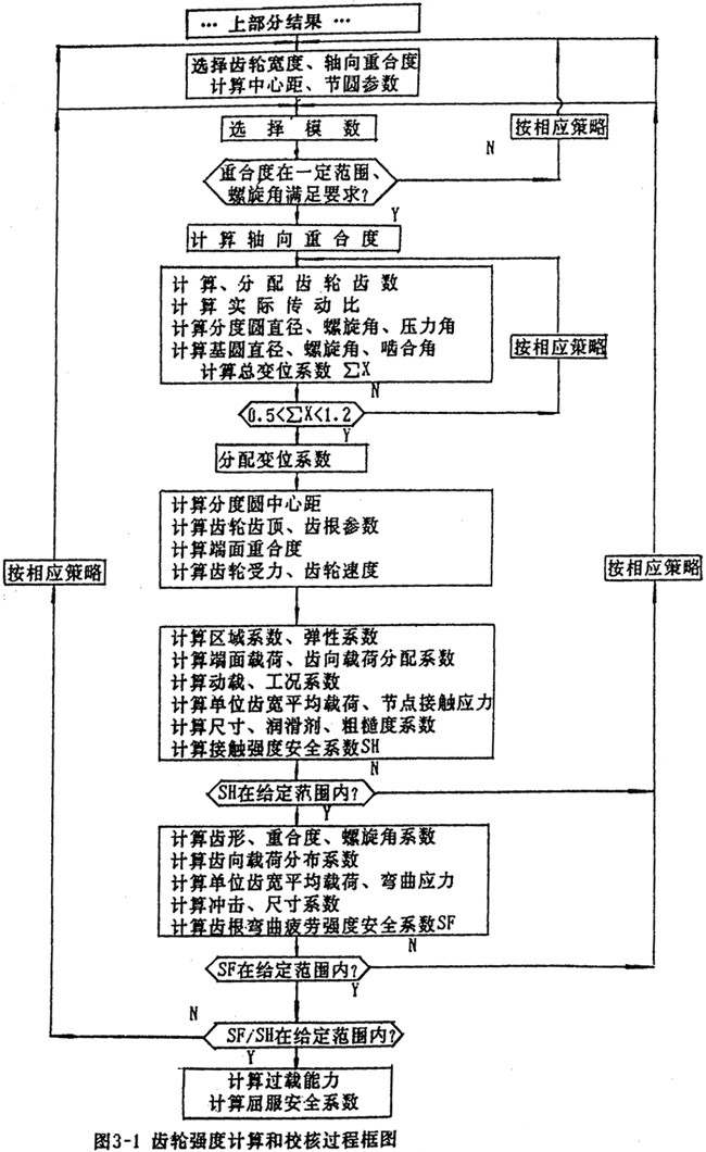 以上所討論的知識(shí)表達(dá)的各種方式均是建立在一定格式的基礎(chǔ)上的,可以說(shuō)是知識(shí)的描述性(declarative)表達(dá)方式。這類知識(shí)的表示一般具有模塊性,自然性,清晰性等。但正是由于格式的限制,因此對(duì)于某些功能,如回溯、反復(fù)的校核計(jì)算等這樣一類操作,不如用語(yǔ)言編寫知識(shí)過(guò)程來(lái)得方便。用語(yǔ)言形式直接編寫知識(shí)過(guò)程,便有了圓柱齒輪減速器設(shè)計(jì)知識(shí)的過(guò)程表示?驁D3-l是齒輪強(qiáng)度計(jì)算、校核的過(guò)程框圖,這樣一個(gè)過(guò)程需要多次重復(fù)的計(jì)算。使用過(guò)程表示可使求解過(guò)程按照嵌入的程序次序進(jìn)行調(diào)用,它們不需要和選擇那些不相關(guān)的知識(shí),也不需要那些不自然的推理路徑。同時(shí),還能夠把領(lǐng)域特有的,導(dǎo)致更為直接推理過(guò)程的啟發(fā)性知識(shí)結(jié)合到設(shè)計(jì)過(guò)程中去,因而能夠大幅度地提高運(yùn)行效率。