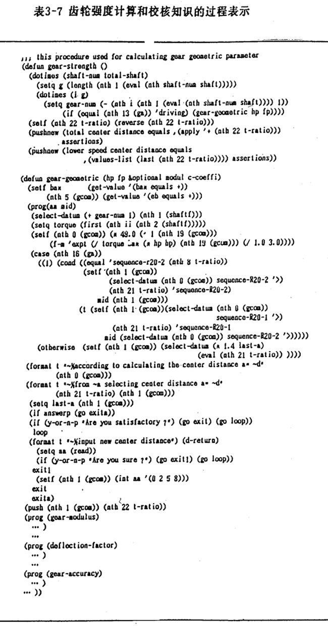 在LlSP語(yǔ)言中,過(guò)程表示用函數(shù)表達(dá),表3-5是圖3-l所示的齒輪強(qiáng)度計(jì)算和校核知識(shí)的過(guò)程表示的形式。