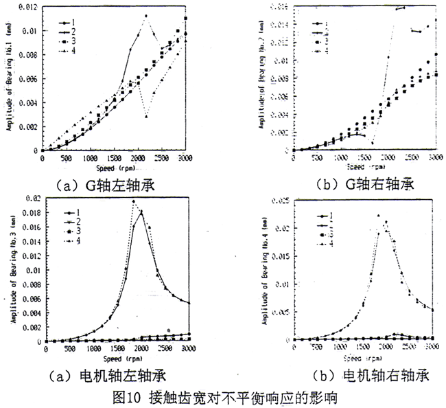 圖4.10a~4.10d表示了接觸齒寬對(duì)不平衡響應(yīng)的影響。圖中符號(hào):1—耦合系統(tǒng)在3處同時(shí)作用不平衡力(全齒寬接觸),2—耦合系統(tǒng)在G軸上作用不平衡力(全齒寬接觸),3—耦合系統(tǒng)在3處同時(shí)作用不平衡力(接觸齒寬為小量),4—耦合系統(tǒng)在G軸上作用不平衡力(接觸齒寬為小量)。從圖中可見(jiàn),在非共振區(qū)接觸齒寬b對(duì)G軸上靠近聯(lián)軸器的右軸承影響較大,對(duì)其它軸承的振動(dòng)影響要小得多。這實(shí)際上反應(yīng)了電機(jī)軸對(duì)G軸耦合程度的增加。